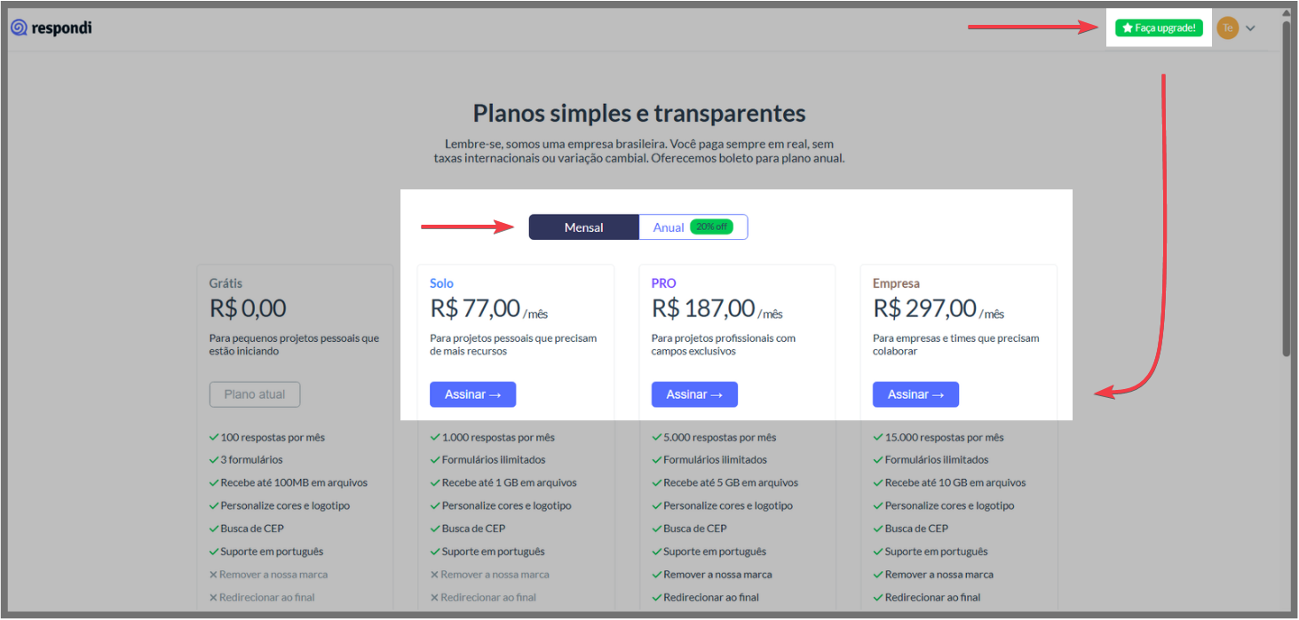 Caso já tenha contratado um plano de assinatura e queira fazer um Upgrade e melhorar a sua experiência com novos recursos como aumentar a franquia de respostas, remover a nossa marca, validação de CPF e CNPJ, Facebook Pixel, Google Analytics ou criar Times e Permissões para múltiplos usuários, veja o artigo Como faço a troca do meu plano de assinatura?