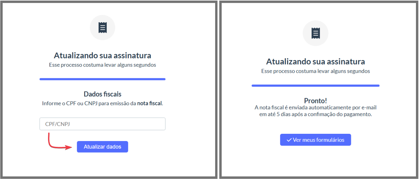 - Na tela seguinte, preencha o campo de CPF/CNPJ para emissão da Nota Fiscal e clique em "Atualizar dados";