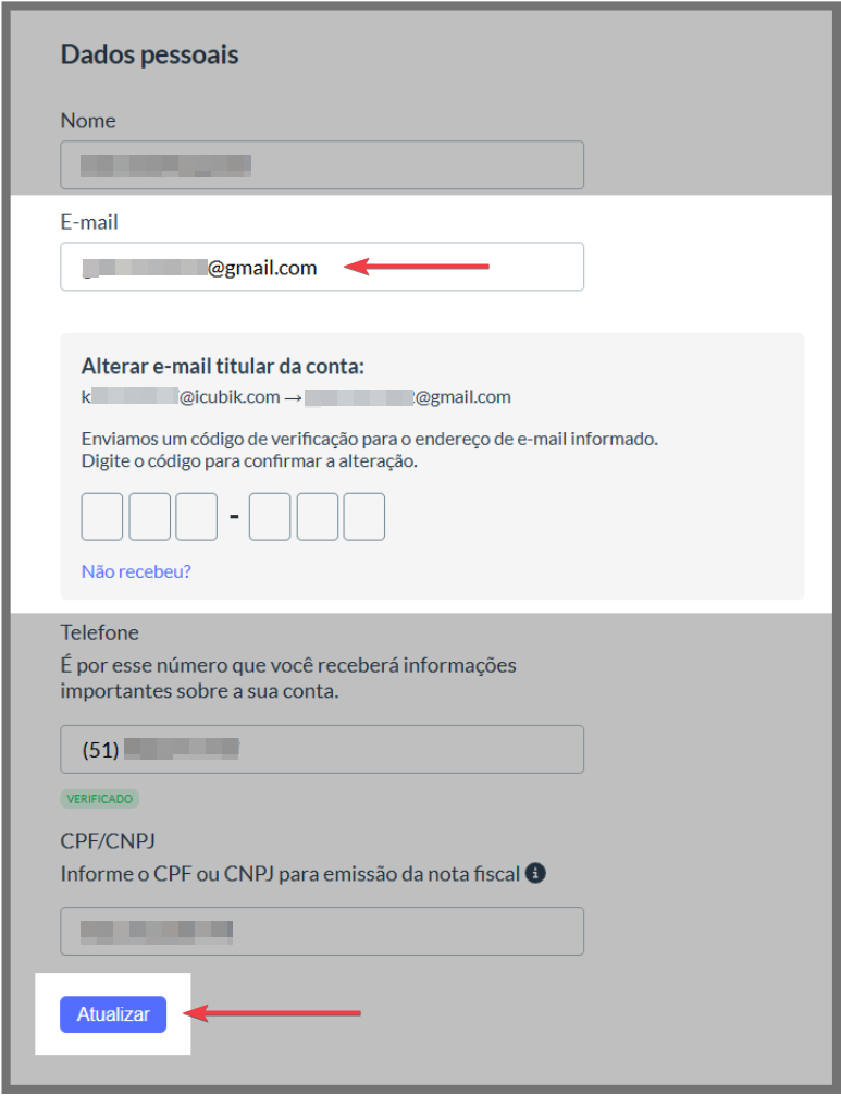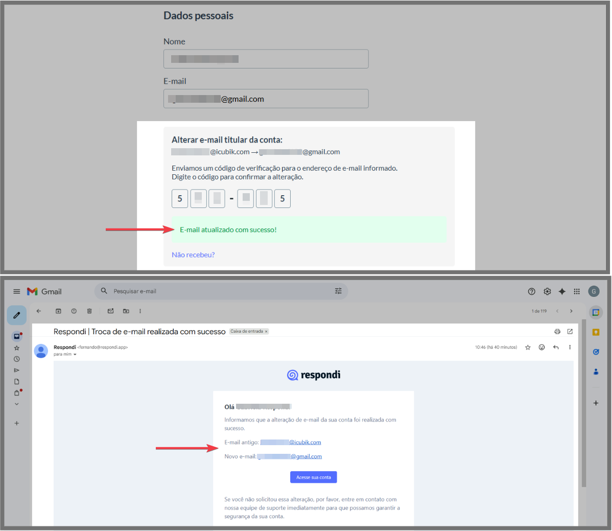 - Após informar o código corretamente, você verá a mensagem “E-mail atualizado com sucesso!”;