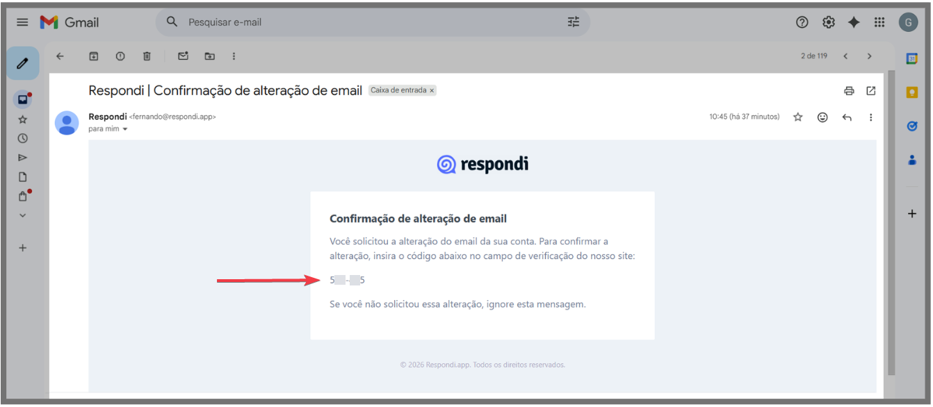 - Acesse sua caixa de entrada, copie o código recebido, cole no campo de verificação exibido na tela de Configurações do Respondi e pressione Enter para confirmar;