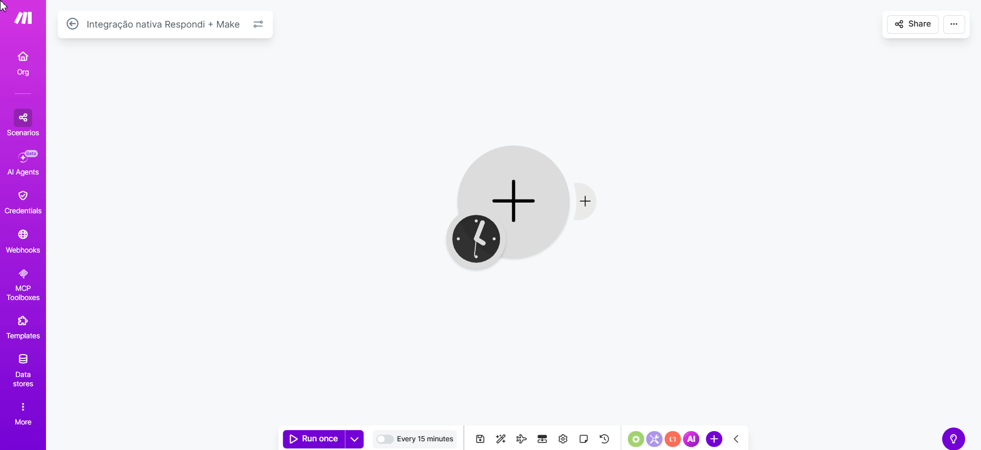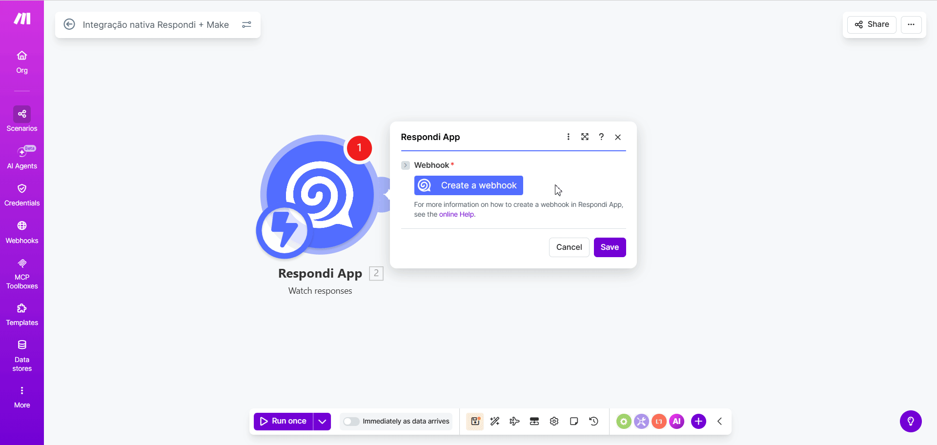 - Em seu cenário da Make, clique em "Run once" para enviar um disparo teste;