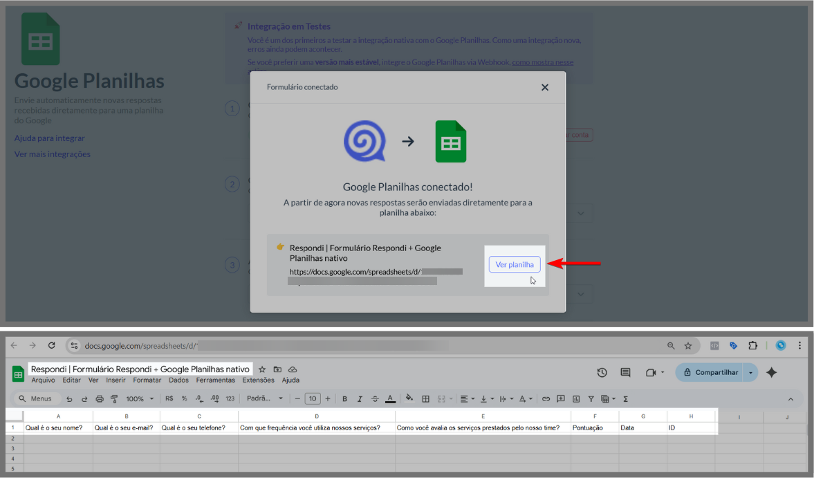 - Na página de "Formulário conectado", clique em "Ver planilha" e acesse a planilha criada que abrirá em uma nova guia;