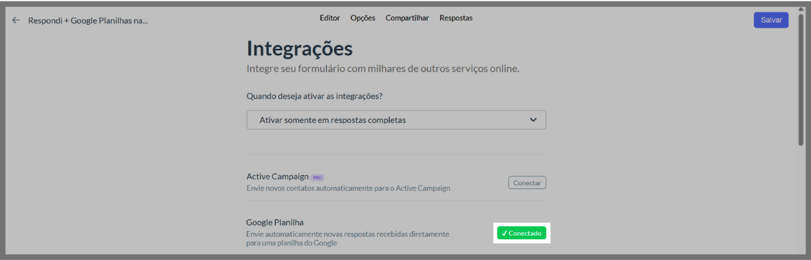 - Ao concluir, na parte de "Integrações > Google Planilhas", aparecerá o botão verde de "Conectado";