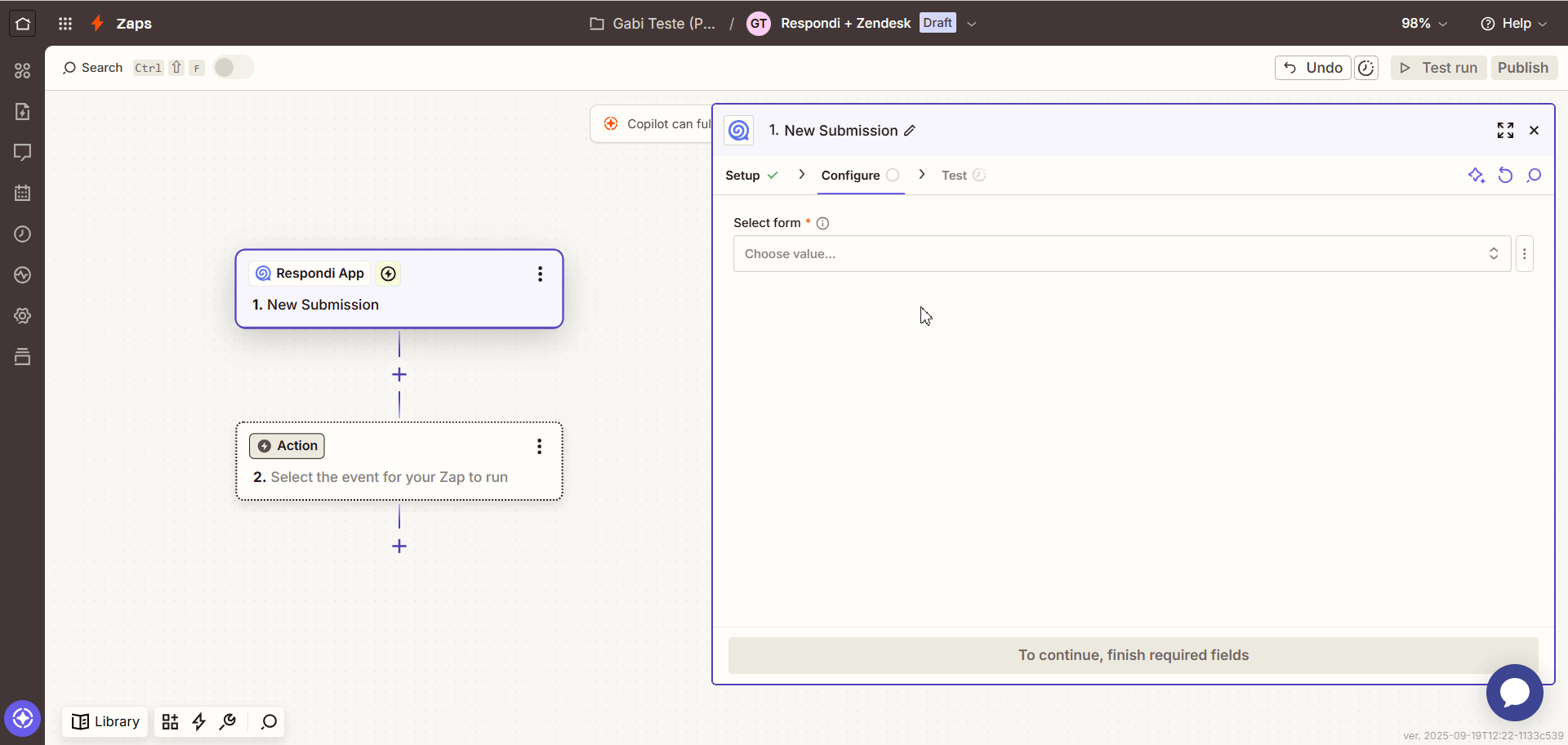 Neste exemplo, vamos configurar o evento para criar novos contatos na Zendesk a cada resposta recebida no formulário. Você pode seguir esse passo a passo ou adaptar para o cenário que preferir: