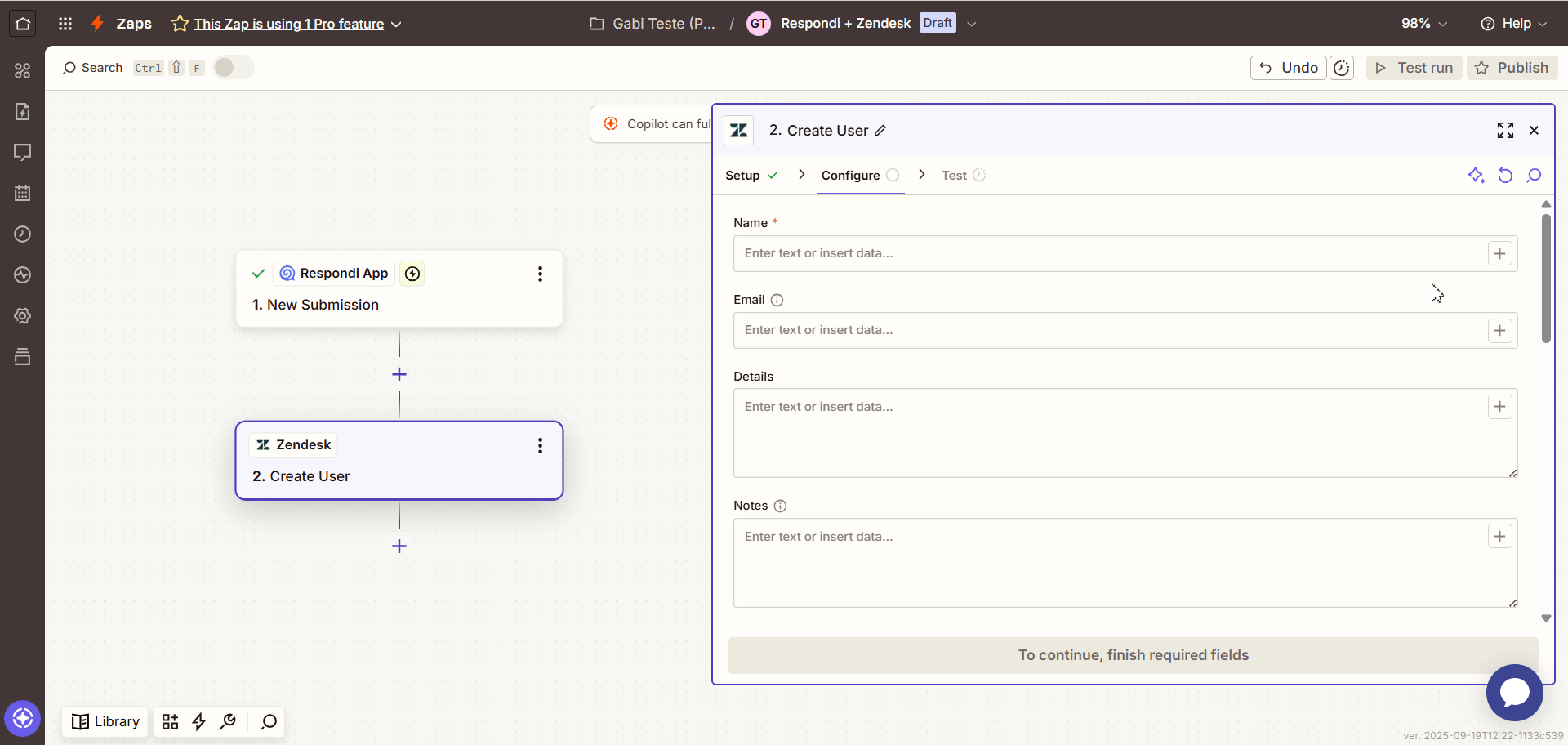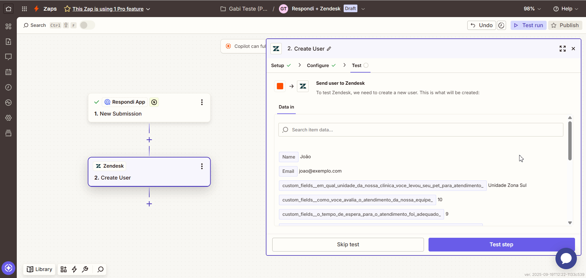 - Clique em "Test step" e confira se os dados foram enviados para a Zendesk de acordo com a configuração realizada;