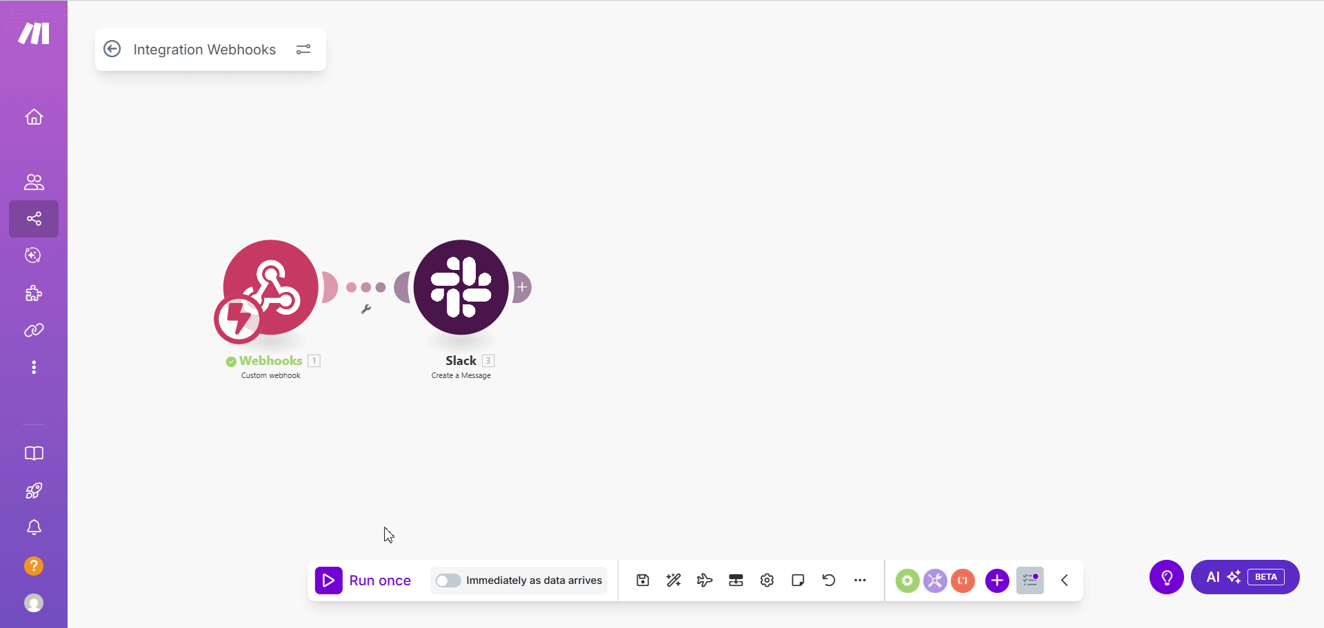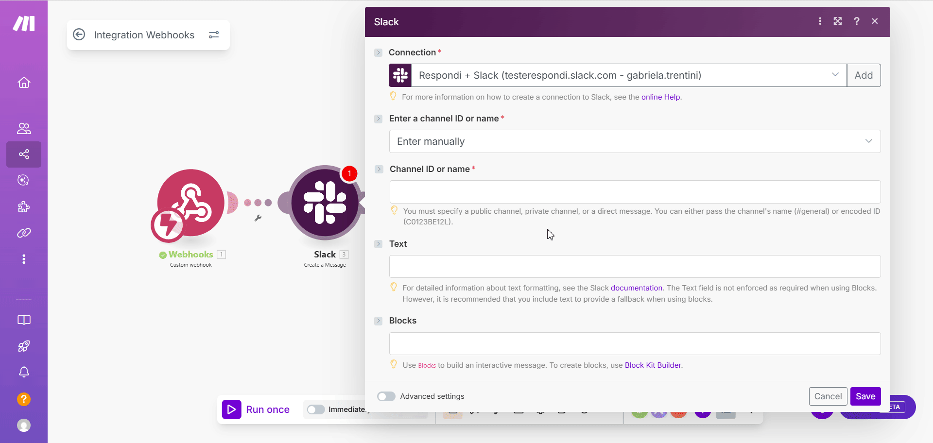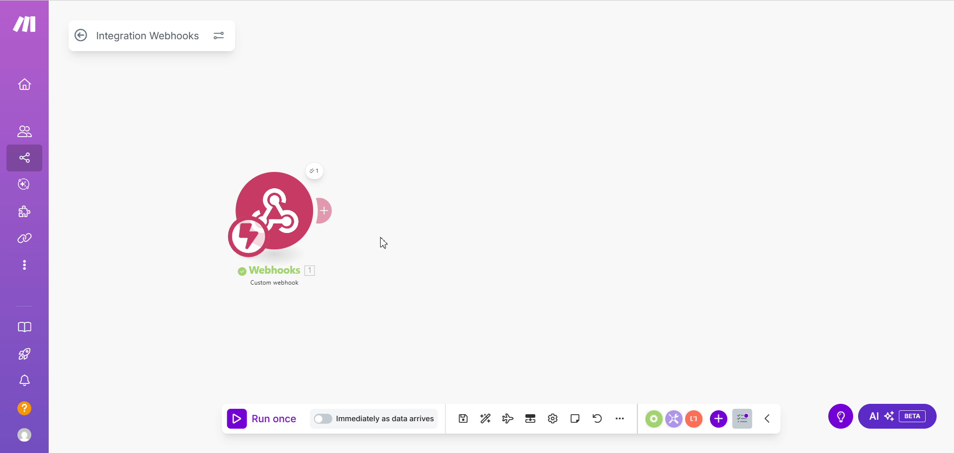 - Em seu cenário da Make, clique em "Run once" para enviar um disparo teste;