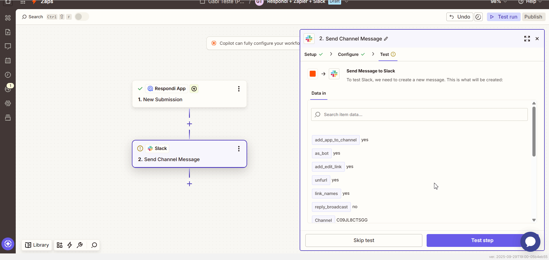 - Clique em "Test step" e confira se os dados foram enviados para o seu canal do Slack de acordo com a configuração realizada;