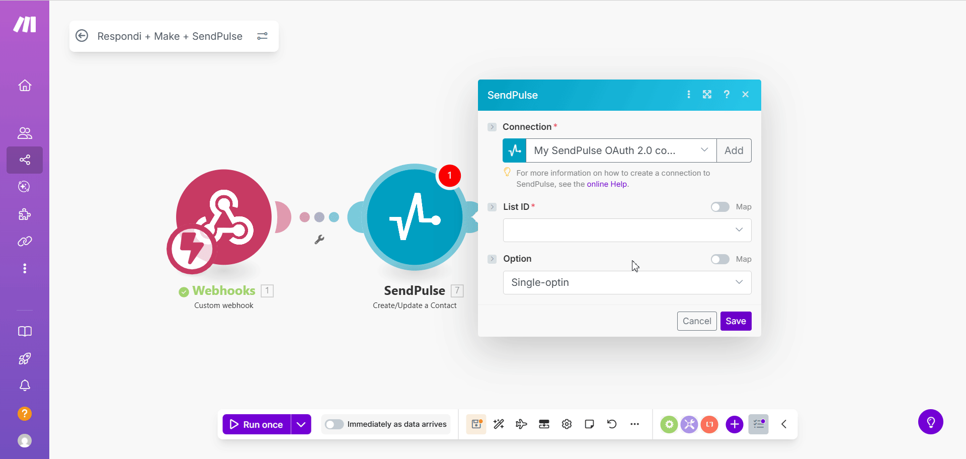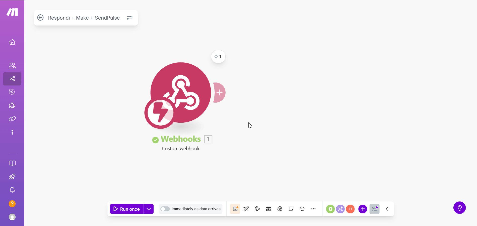 - Em seu cenário da Make, clique em "Run once" para enviar um disparo teste;
