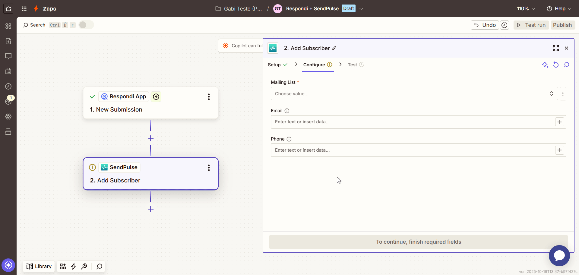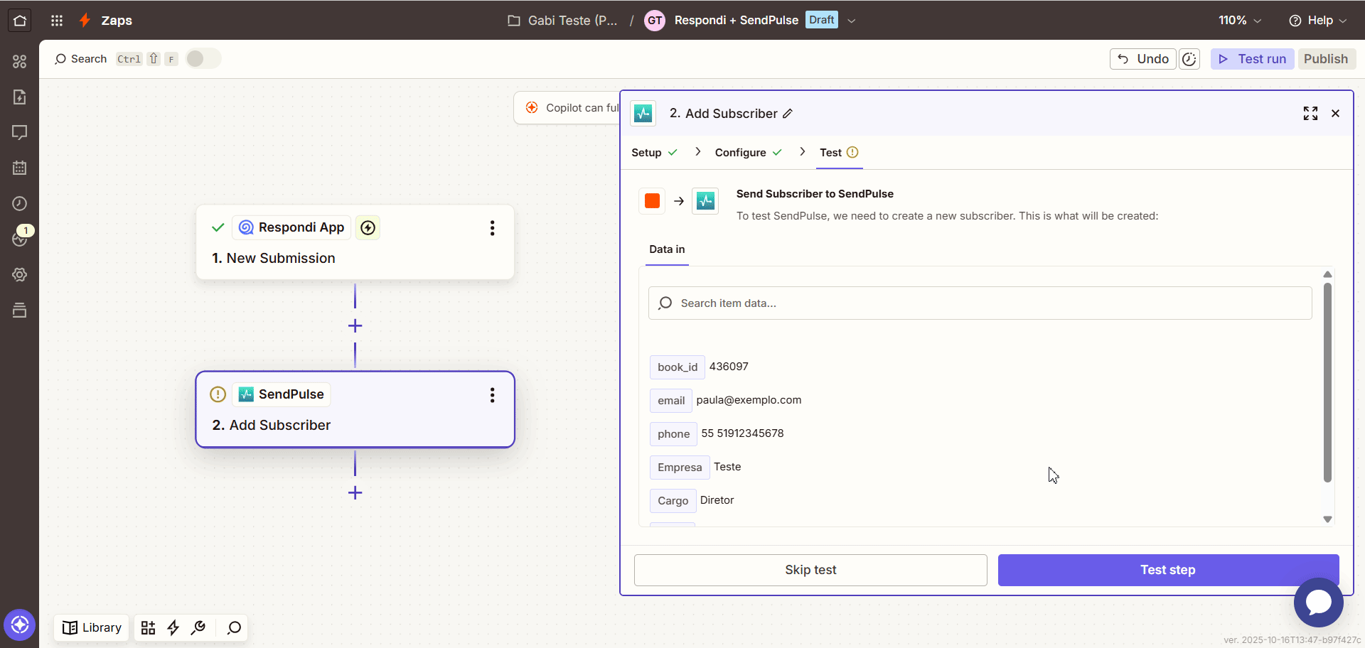 - Clique em "Test step" e confira se os dados foram enviados para a sua lista da SendPulse de acordo com a configuração realizada;