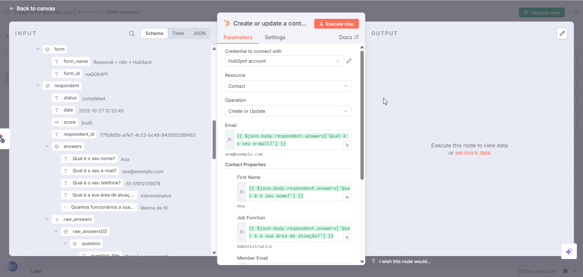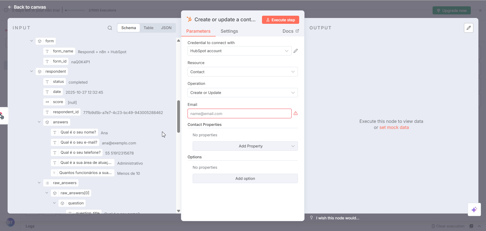 Neste exemplo, vamos configurar o evento para criar novos contatos no HubSpot a cada resposta recebida no formulário. Sinta-se à vontade para adaptar o cenário conforme as suas necessidades: