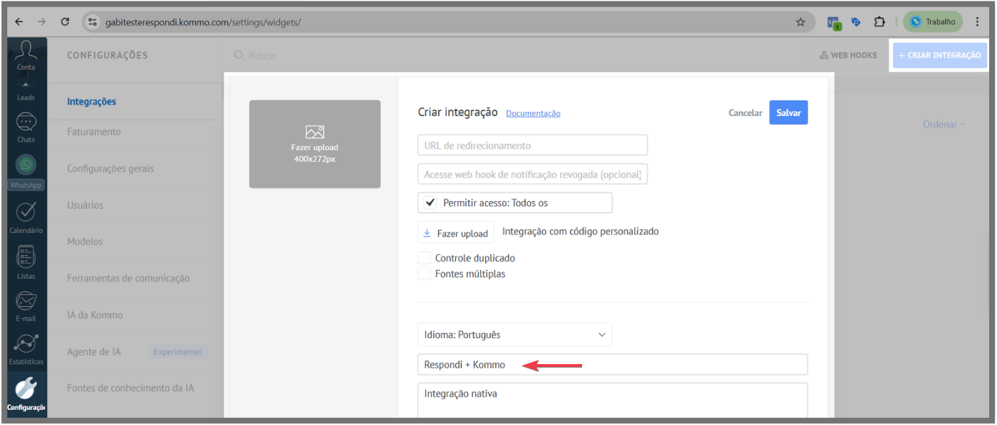 - Dê um nome à integração, por exemplo: Respondi + Kommo;