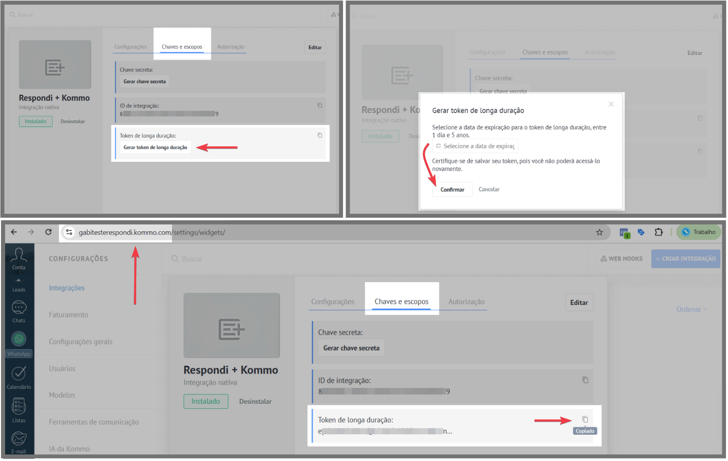 Antes de conectar a integração no Respondi, é necessário gerar os dados de acesso (token e URL da conta) dentro da Kommo: