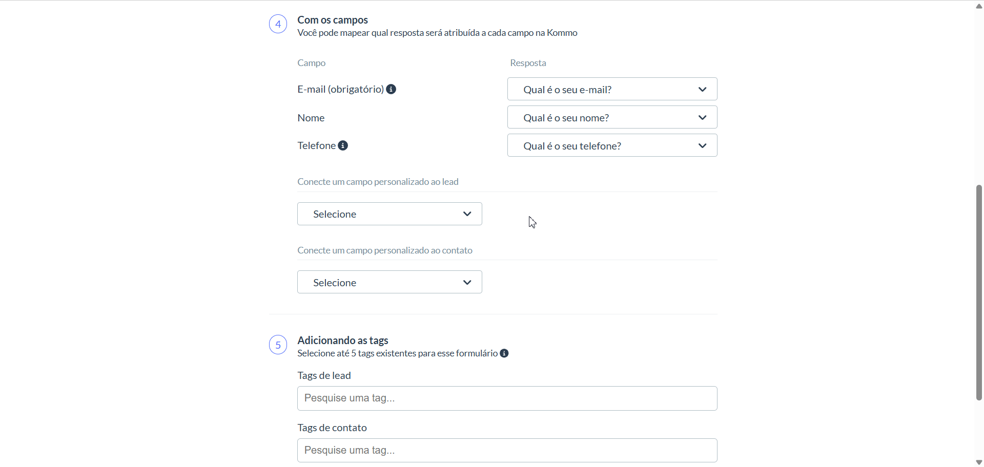 - Se desejar, adicione tags que foram criadas na sua conta Kommo: Gerencie tags na Kommo;