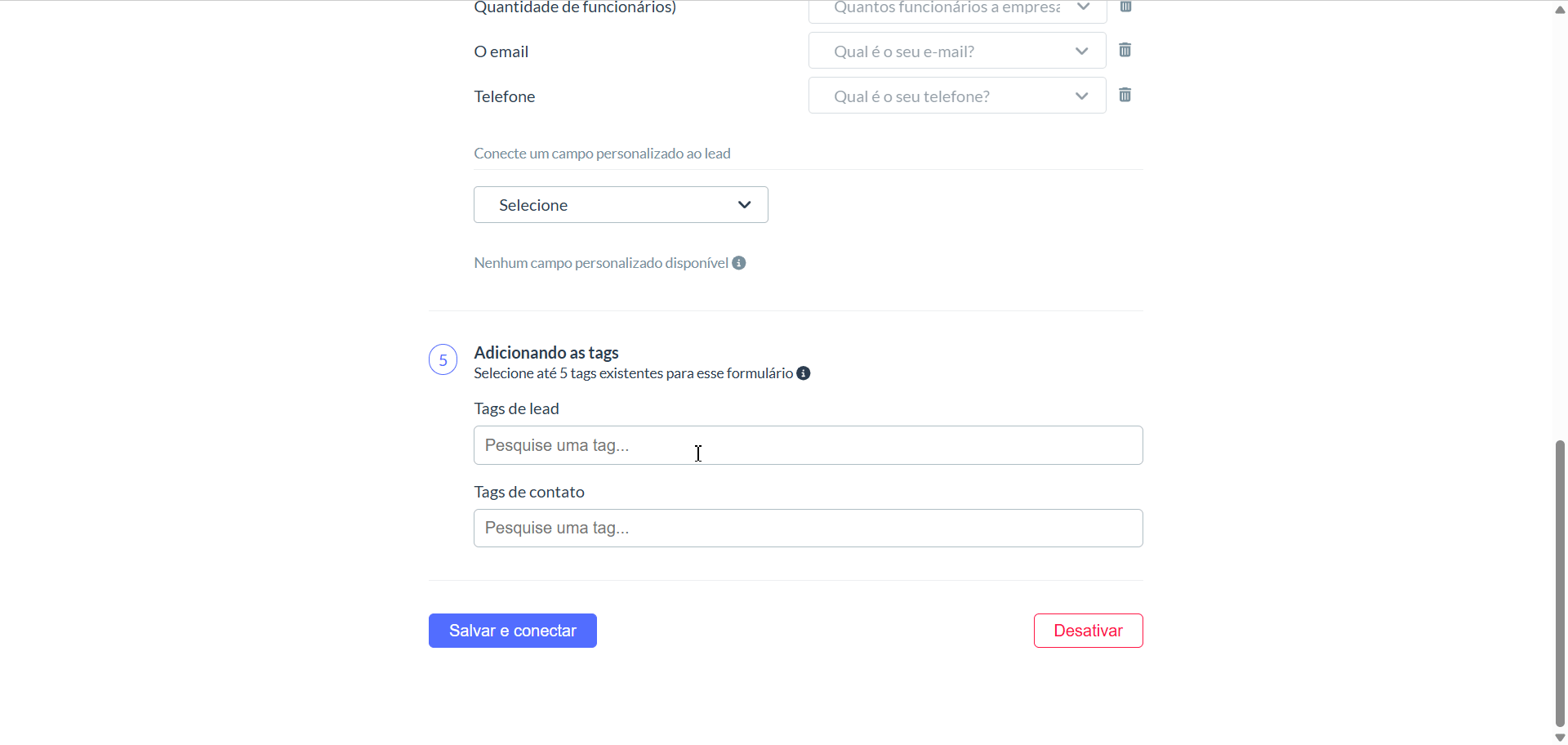 - Verifique se as tags foram adicionadas na parte de “Lead” ou “Contato”. Adicione as tags na área correspondente ao que deseja atualizar.