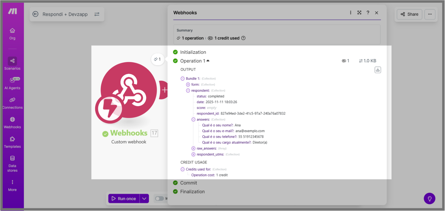 - Na Make, clique em "Run once" e acesse o formulário que você acabou de integrar;