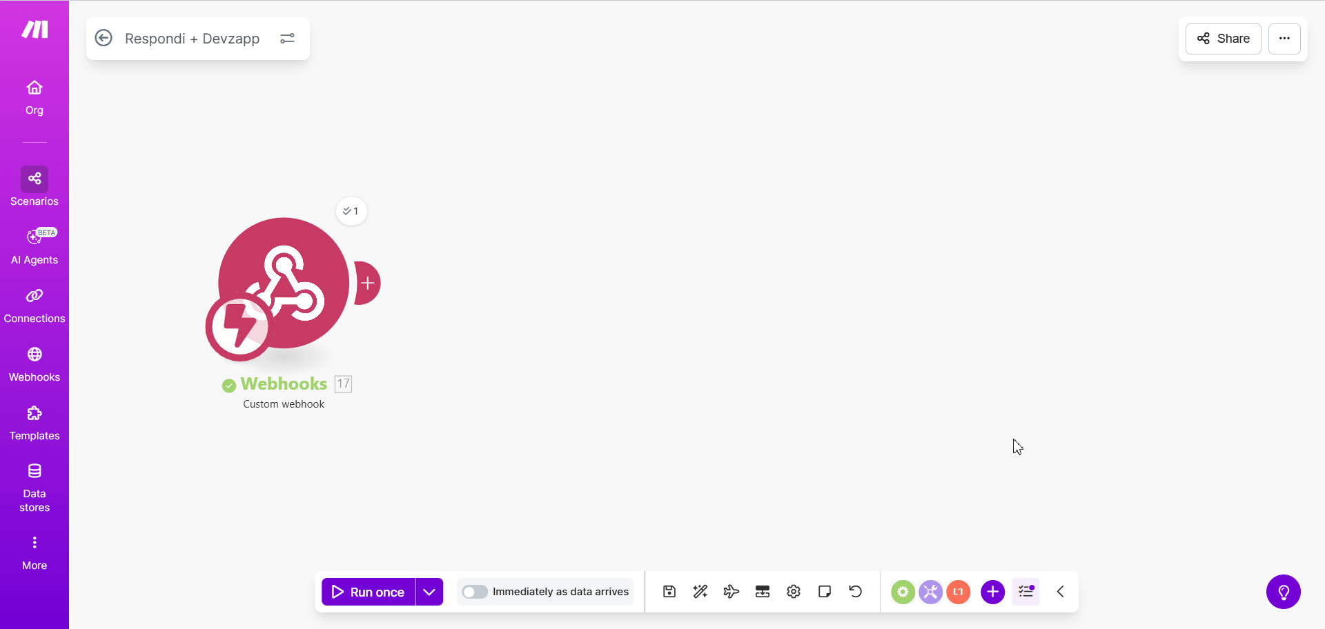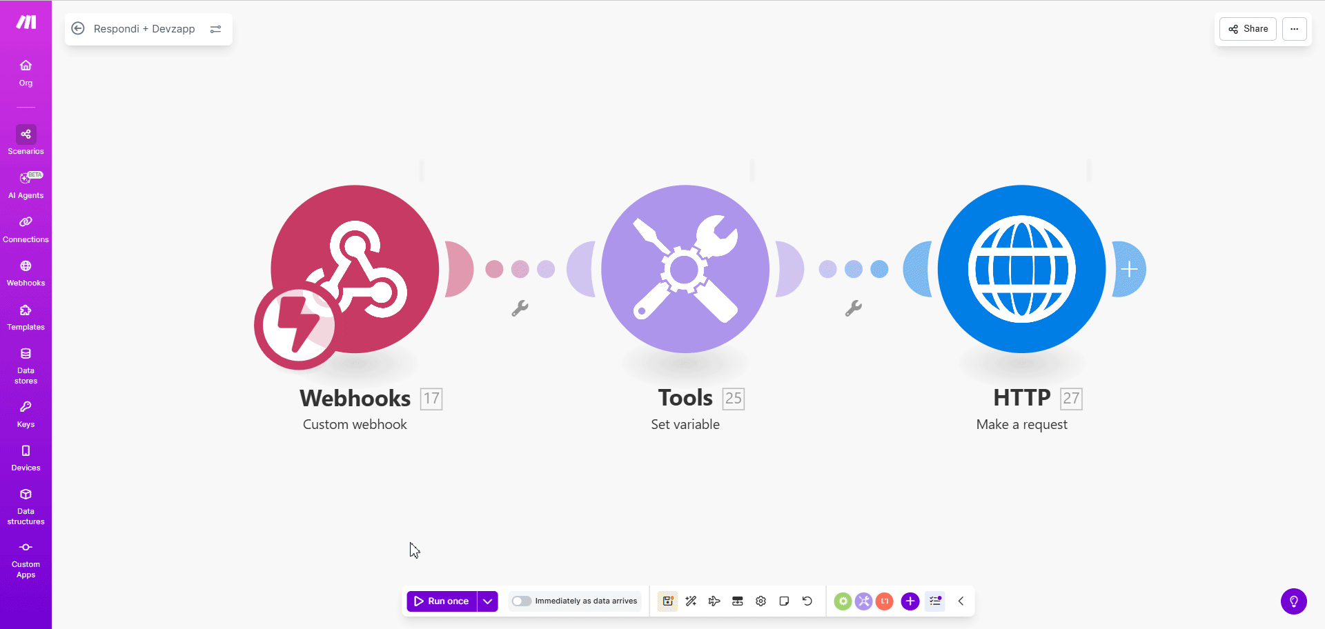 Neste artigo, você vai aprender como configurar o Respondi ao Devzapp via Make webhooks, para enviar mensagens automáticas personalizadas aos respondentes que preencherem seu formulário. As mensagens são enviadas diretamente pelo seu número de WhatsApp conectado ao Devzapp.