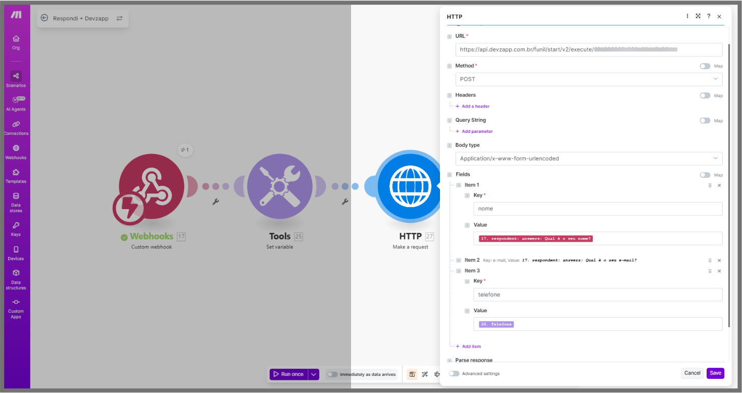 Após formatar os campos (como o número de telefone), o próximo passo é enviar esses dados ao Devzapp. Para isso, basta utilizar o módulo HTTP da Make, que permite enviar requisições diretamente para uma URL de webhook.
