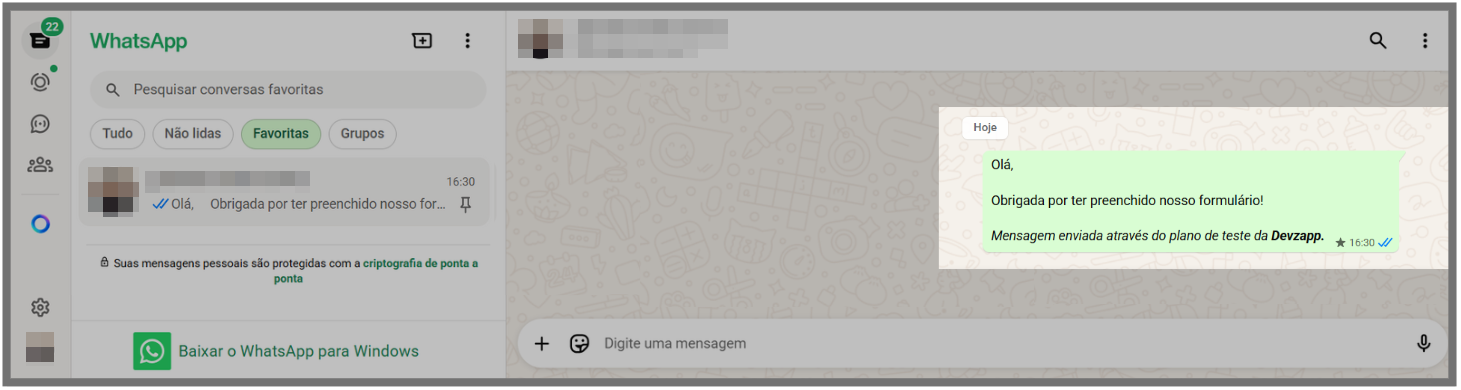 - Acesse o Whatsapp do número informado e verifique se a mensagem foi recebida com sucesso;