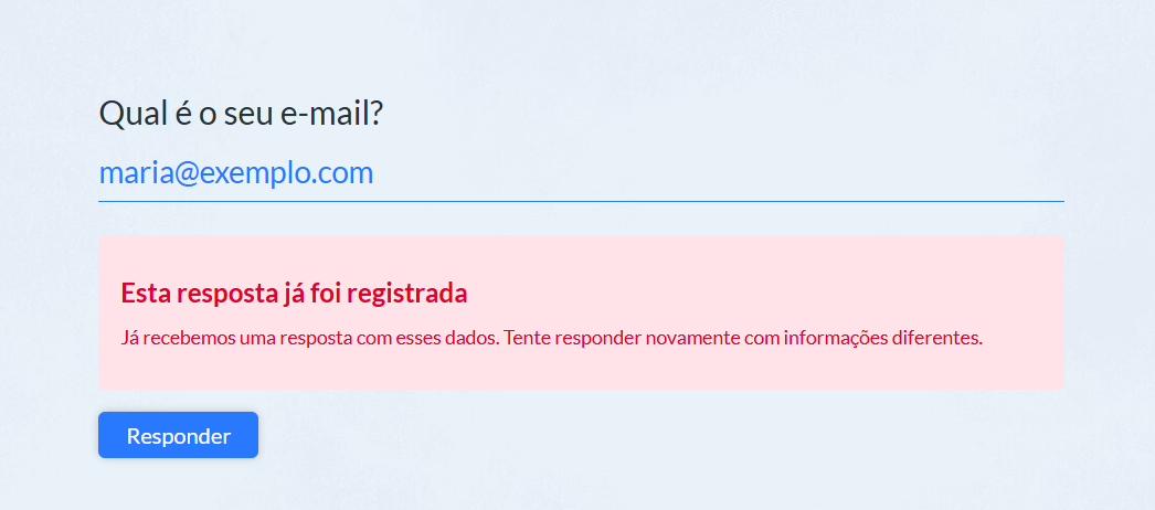 Depois disso, se um respondente já tiver enviado o formulário usando um valor específico (por exemplo, um número de Telefone como (51) 912345678 ), esse mesmo valor não poderá ser utilizado novamente nesse formulário.