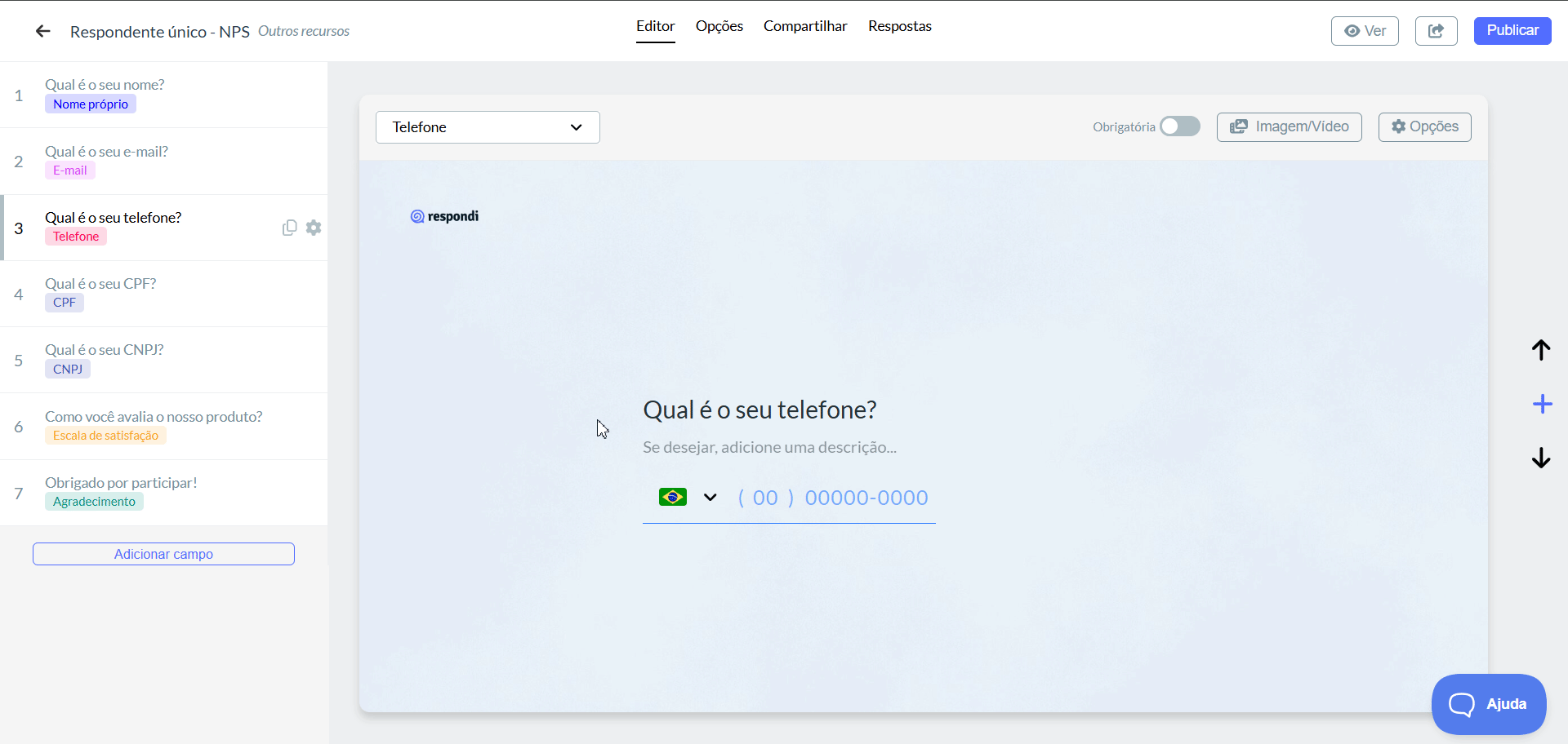 - Na aba "Editor" do seu formulário, crie o campo que deseja usar como identificador único (E-mail, Telefone, CPF ou CNPJ);