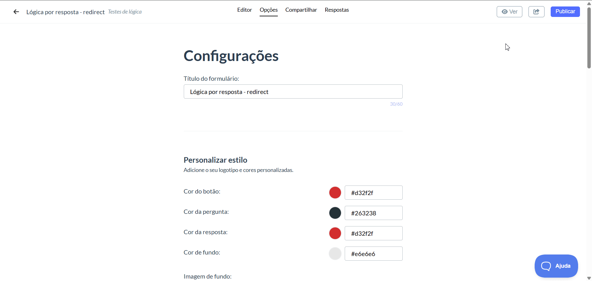 - Na categoria de "Personalizar estilo" você poderá customizar as cores do botão, pergunta, resposta e fundo do seu formulário;