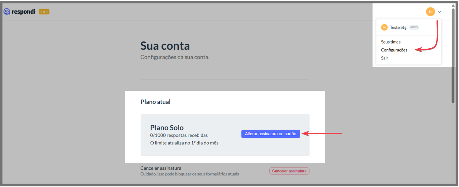 - Na parte de "Plano atual", clique no botão azul "Alterar assinatura ou cartão";