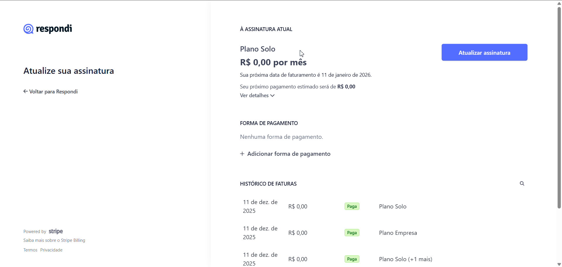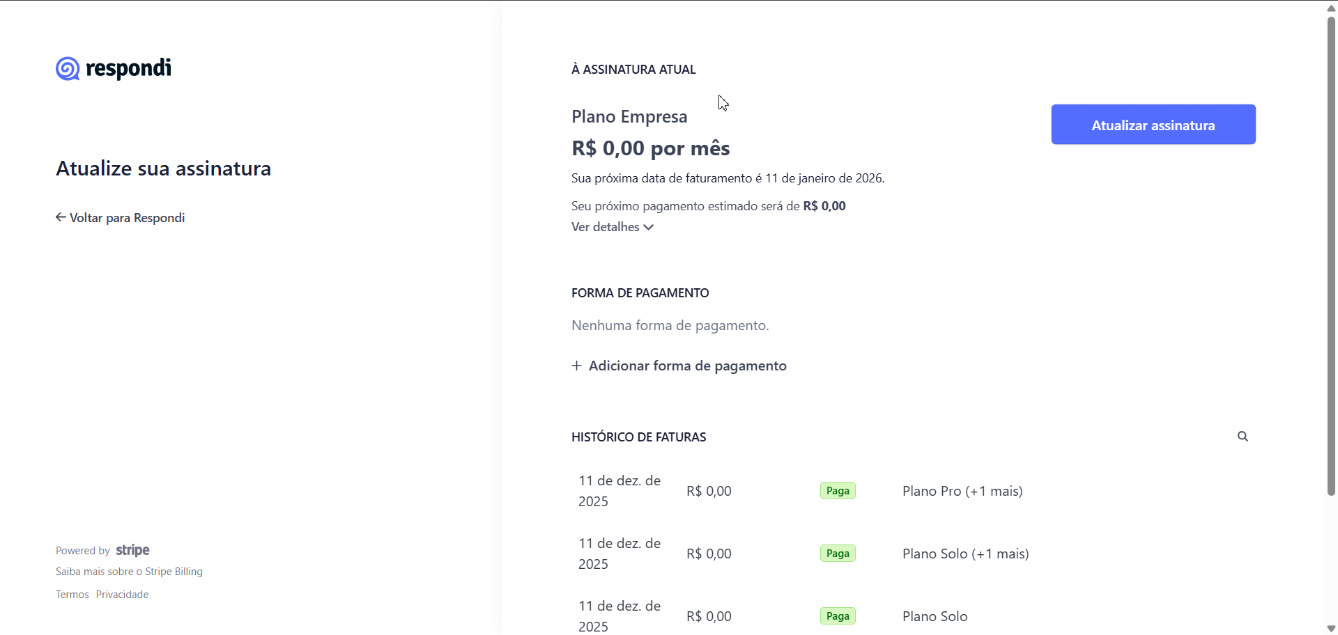 - Na tela de "Assinatura atual", clique no botão azul de "Atualizar assinatura";